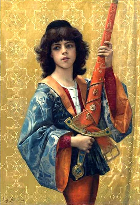 Octave Mirabeau wrote that Cabanel had “a hand accustomed to the conjuring up of forms, to tracing distinctive lines, the soul of a Prix-de-Rome winner with the eye of a photographer. Such is M. Cabanel.” The subject may be seen as a conscious statement to this effect. With its stylistic affinities to the 15th Century, Cabanel was perhaps paying homage to the Renaissance masters he admired. Cabanel shows handsome young boy, brightly clad in page’s garb, holding up a sword in an elaborately decorated scabbard. The page makes a beautiful silhouette against an embroidered golden curtain. The values are subtly adjusted to achieve a flat, decorative effect that makes it very attractive from a distance. The boy’s head is beautifully rendered.