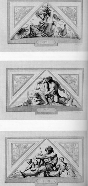 The architect Jean-Baptiste Cicéron Lesueur (1794-1883) commissioned Cabanel to decorate 12 triangular pendentives illustrating the Allegories of the Months of the Year for the Salon of the Caryatids in the Paris Hôtel de Ville. Each month is characterized by an appropriate theme: January, The Pilgrim Recounting His Travels to his Family; February, The Masquerade; March, The Flood; April, The Awakening of Nature; May, The Lovers; June, The Hay Reapers; July, The Harvesters; August, The Fruit Harvest; September, The Grape Harvest; October, The Fall of the Leaves; November, The Hunt; December, The Study. Cabanel executed the paintings during 1852-53. His friend and compatriot, Léon Benouville, contributed four paintings depicting the seasons. This was Cabanel’s first opportunity to paint decorative works for one of the most beautiful and significant buildings in Paris. He rose triumphantly to the task and created the finest decorations of his lifetime. The influence of Michelangelo and Annibale Caracci is evident in the simple, muscular figures. The designs are superb and the figures and accessories are beautifully disposed within the spaces. His choice of motives for each month is delightfully inventive. Although small in size, their conception and execution is monumental.