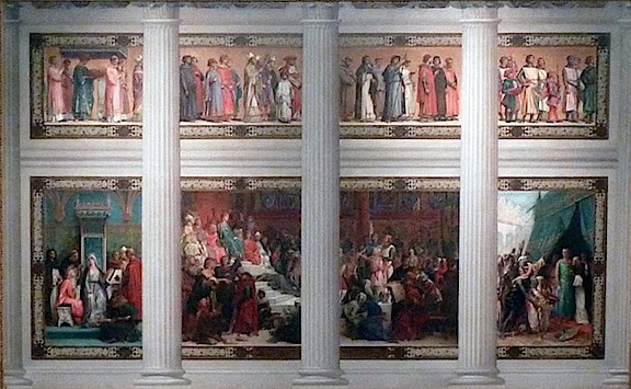 Chennevières issued decrees to each of the artists stipulating the subjects of their murals. Most of the cycles consisted of one main panel and one side panel, either to the left or right. Two stone half-columns divide the main panels into three sections. The decree required that the three main panels be designed to appear as though they were a single composition that passed behind the half-columns separating them. Above each of the murals ran a frieze depicting a procession of important national, religious, and historical figures. In keeping with its function as a national monument, the frieze included patron saints of provincial French cities.