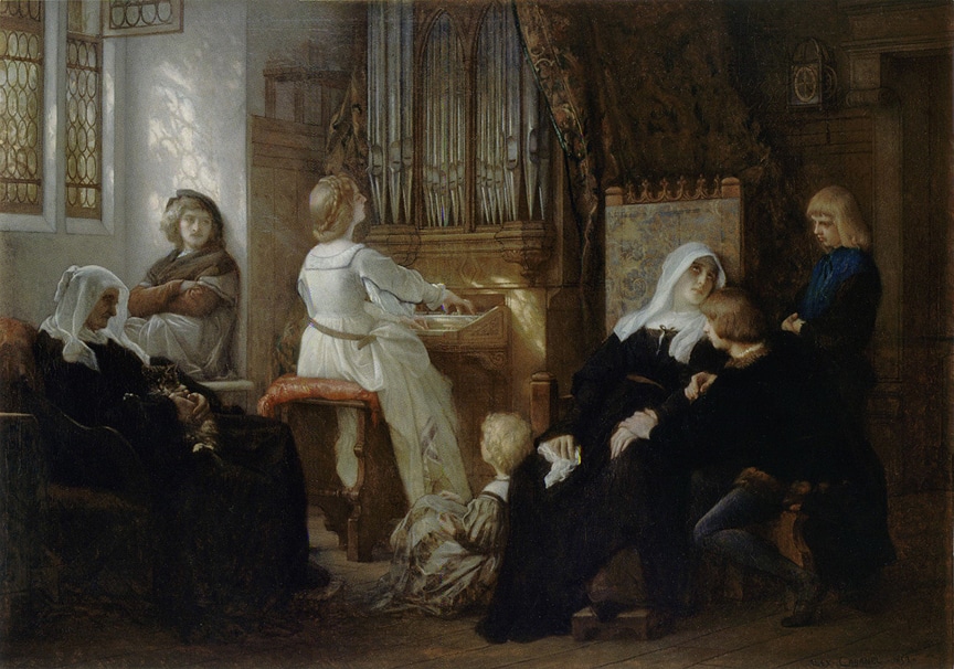 That same year, Cabanel’s shift toward genre painting is evident with intimate The Choirmaster’s Widow, whose melancholy theme and medieval accouterments are reminiscent of some contemporary German interiors. The refined drawing and sentiment, however, are clearly French. The grieving widow listens to the music of her deceased husband, surrounded by their children and his elderly mother, who sits on the left, caressing a cat. Near the window, a handsome young man, perhaps the husband or paramour of the beautiful organist, listens to the music in rapt admiration. Cabanel’s painting portrays a profound sentiment without becoming overly sentimental.
