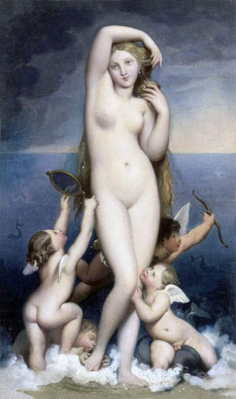 The Birth of Venus is an iconic image of the 19th Century and is one of the best-known examples of French academic painting. Cabanel exhibited the work in 1863 to widespread acclaim. Part of the charm of Cabanel’s paintings is his remarkable ability to create modern and personal works that, nevertheless, are deeply rooted in the great tradition of Western art. For the French aristocracy of the time, the link to traditions prior to the Revolution evoked memories of the aristocracy at its height. The subject has inspired numerous masters throughout the centuries, from Botticelli and Ingres to Bouguereau. References to paintings by older masters, as well as the recent classics, are continuously present in Cabanel’s art. As with most of his major works, The Birth of Venus can be viewed in light of such artistic influences. The pose of Venus is similar to a female figure in The Bacchanal of the Andrians by Titian and the nude in Odalisque and Slave painted twenty-one years earlier by Ingres, who probably borrowed the gesture from Titian. The flying putti remind us of Boucher’s The Triumph of Venus and are the precursor of Bouguereau’s more complex painting of the same subject. In ancient Rome, Venus (Aphrodite in Greek mythology), the goddess of beauty and love, was named loveliness after her greatest attribute, whereas in the Greek language she is named “foam born,” after the manner of her birth. There are two versions of the story of her birth. In Hesiod’s more popular version, Aphrodite sprang from the foam of the sea as a fully developed woman. Zephyrus, the God of the west wind, then carried her across the sea on a clam shell, to Cythera and then to Cyprus. There, Aphrodite was welcomed by Horae, daughter of Themis, who dressed her up and adorned her with precious jewels before taking her to the Immortals at Olympus. Homer’s version of the account, the older of the two, never became widespread.