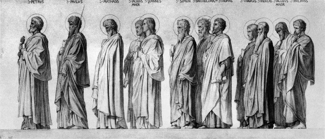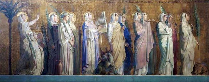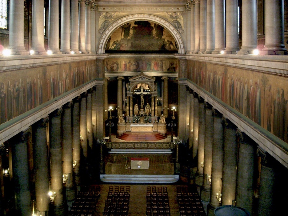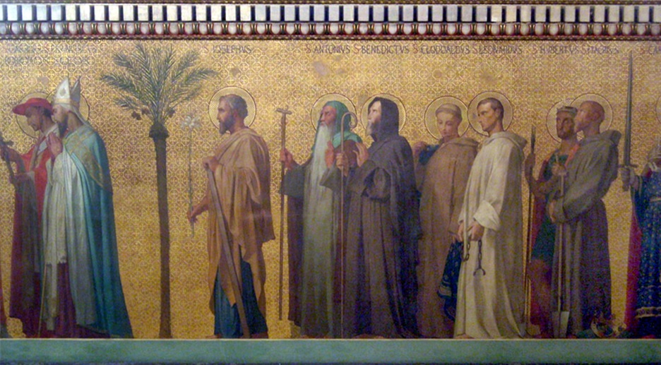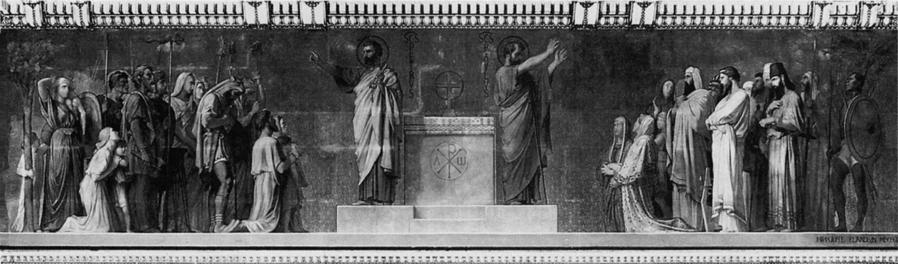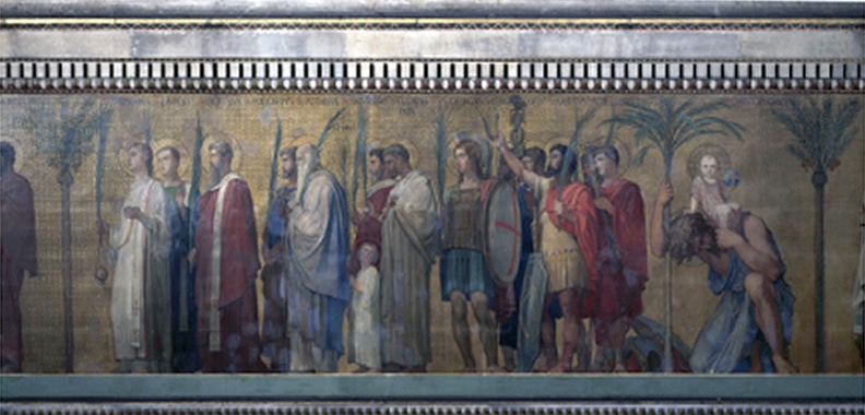 In the long nave of Saint Vincent-de-Paul Flandrin reveals his full genius as an artist and a decorator, beautifully integrating his painting with the architecture to form one grand and harmonious unit. The frieze, which depicts Christians from throughout history walking in procession toward the choir, is supported by tall pillars below and supports slightly shorter ones above. The procession consisted of one hundred seventy-one figures, eighty-eight on the left and eighty-three on the right. The persons were divided into groups, first broadly according to gender, women on the left of the choir and men on the right. The men and women were then divided into smaller groups according to office or activity. The men were grouped as: Apostles, martyrs, doctors, bishops, and confessors; the women as: virgin martyrs, virgins, female saints, penitents and, at the end of the women, couples, and families. Flandrin took extreme care with his programmatic research to ensure that the models, clothing, accouterments, and gestures of the personages he was portraying were as historically correct and as expressively appropriate as he could make them. The figures are silhouetted against a base of gold leaf and were painted in oil mixed with a wax vehicle in an effort to imitate the matte finish of a fresco. They rival those of the Parthenon for beauty of contour and dignity and variety of gesture and costume. The rhythmic variation in their grouping and spatial intervals, and the abstract clarity of the parts in relation to the whole when seen from a distance, are comparable to the great Greek frieze.
