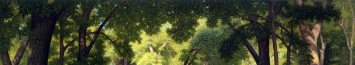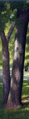 I also had to modify the patterns of values. Nature, what the camera would “see,” was constantly flickering ― broken up into a multitude of small, unrelated and confusing spots of light and dark. I needed to squint and simplify them before I could begin to analyze, select, and organize them coherently. I wanted the trees in the light to the left of the center in the middle distance to be the center of interest. Unfortunately, as they appeared in nature, they had no discernible pattern, just a few scruffy and wilted leaves. They were elm trees which had contracted Dutch Elm Disease and were marked with bright orange rings for removal by the city. I had to invent their patterns of leaves using other trees as a guide. By the time the man with the camera arrived, those trees had been cut down and hauled away. He failed to see that they were missing. The leaves on the trees in the upper portion of the painting also lacked a definite pattern. I needed to invent them or my “cathedral” would have remained roofless, my conception compromised, and the viewer’s eye would again have been allowed to escape from the painting too quickly.