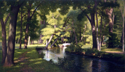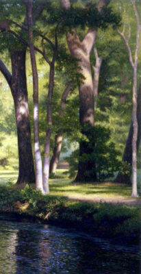 There was also the difficult job of placing the myriad patches of ever-shifting sunlight. The trees continually emerged from the shadows into the sunlight and then plunged back again. The light and shadow on them and streaming across the ground and water constantly moved as well. I had plotted their placement as the afternoon passed, using them to make decorative patterns of light and dark. At no one time could they be observed as they appear in the painting.
