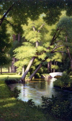 For this painting, I wanted a dignified and stately feeling: cathedral-like, quiet and serene. When choosing the location, I looked for the basic elements through which this feeling could be expressed. The values were predominantly within the middle-to-dark range ― cathedral-like ― interspersed with windows of light which could be formed into pleasing patterns. The main lines of the trees rose like columns into the dark mystery of a leafy ceiling. Like large aisles, the pathway and creek swept the viewer’s eye into the middle ground. The spot contained most of the raw material from which I could create an expressive painting.