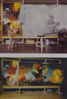 Lack considered the Day of Wrath triptych and The Interior Journey his most important works.[15] He labored on these two series of paintings for over thirty years and spent much of his creative career developing the complex iconography of these symbolic paintings. He felt that he was building upon Gammell’s artistic foundation and further developing the depiction of universal ideas through symbolic imagery. The artistry of these works is sophisticated, and he combined the methods of the Flemish and Venetian painters with brilliant, impressionist color to create works of decorative beauty and expressive power.