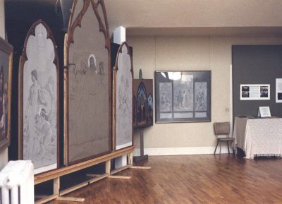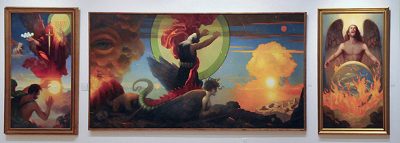 Triptych, L-R: Revelation to Saint John, 1980, oil on panel, 67 x 38; Day of Wrath, 1990, oil on canvas, 67 x 135; Final Destruction, 1992, oil on panel, 67 x 38.
