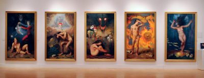 The Interior Journey, L-R: Descent into the Unconscious, 1988; The Dreamer, 1990; Demons, 1996; Trial by Fire, 1990; Trial by Water, 1998. All works oil on canvas, 81 x 51.