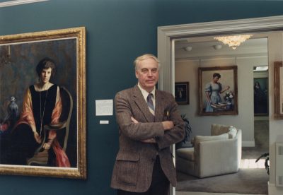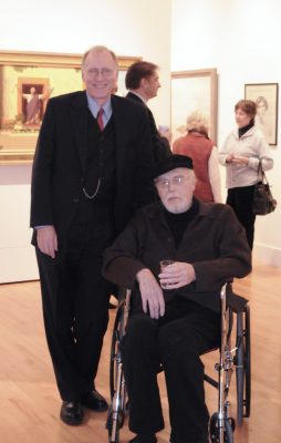 Richard Lack at his Solo Exhibition, Heritage Art Gallery, 1986. To his right is a portrait by R. H. Ives Gammell.