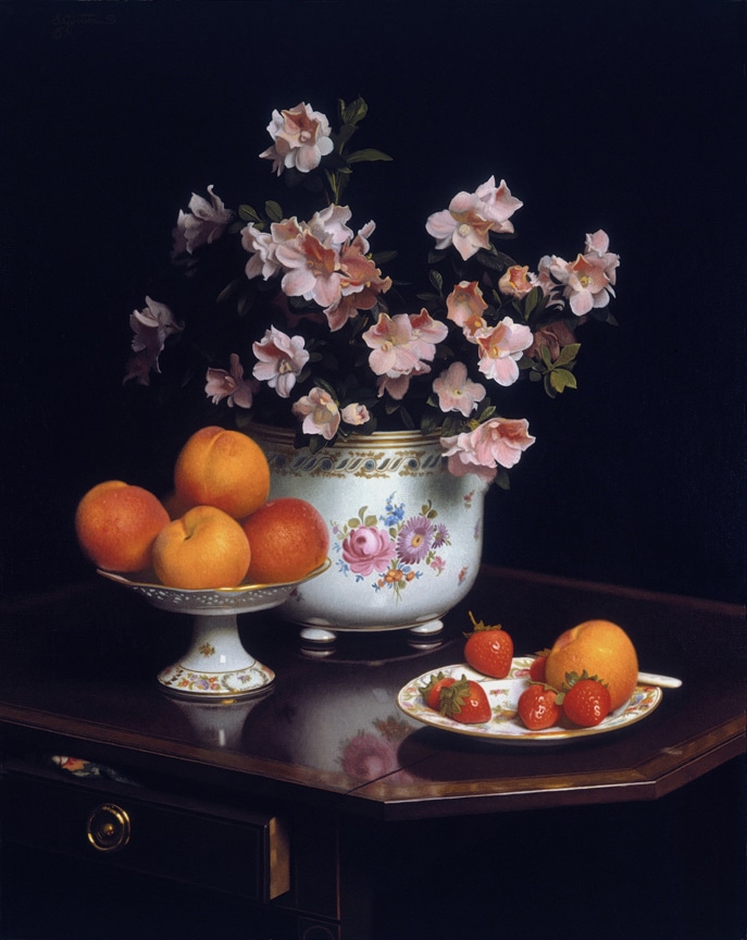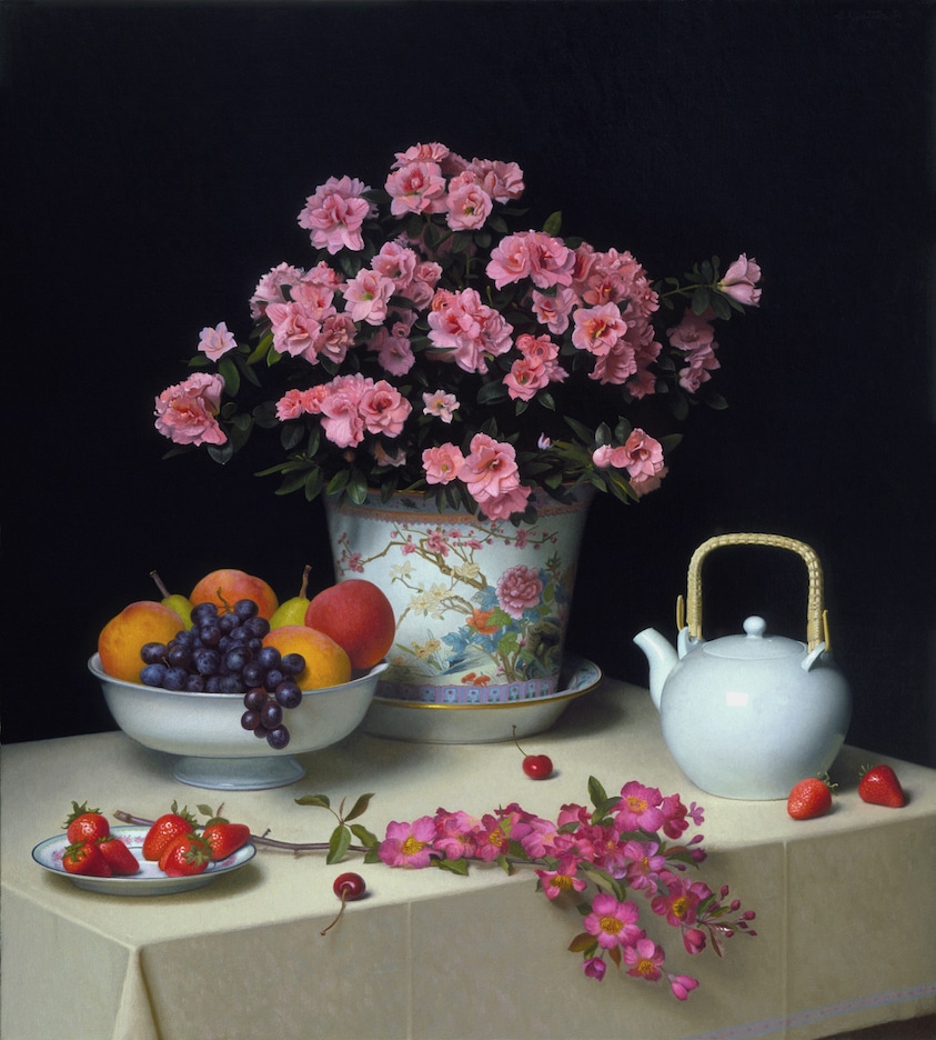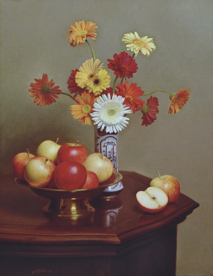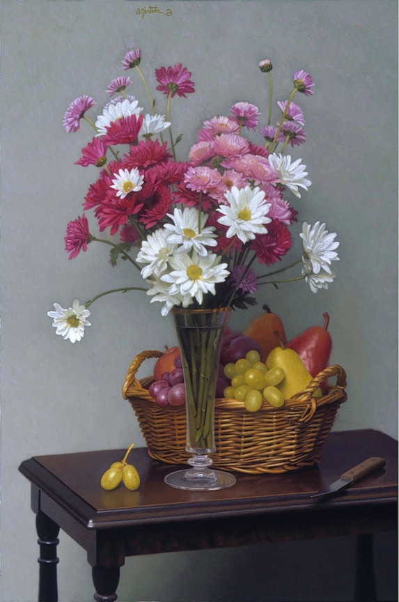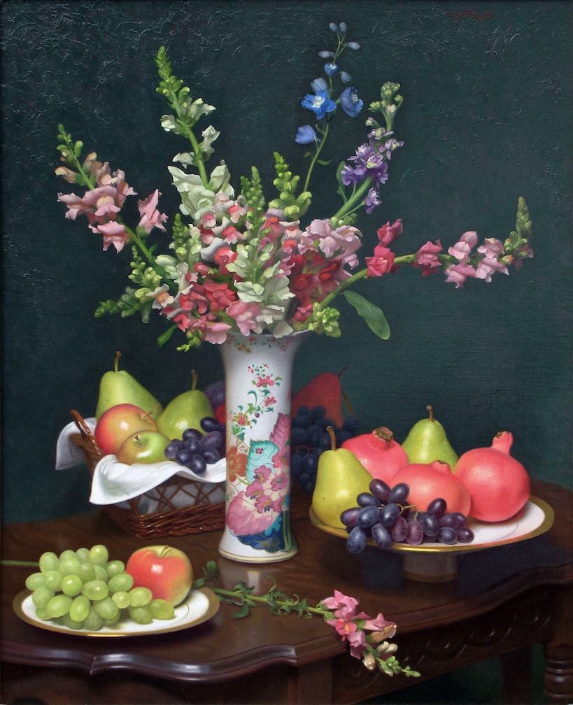 “The beauty of flowers and fruit never fails to inspire me. I will paint no still lifes without them. Our frenetic, media saturated age moves so fast that we often miss the beauty of simple things we see around us every day. I try to slow down and appreciate the marvelous beauty around me. I approach the paintings of flowers and fruit in a somewhat musical way, treating them as variations on a theme, preferring to paint them in shallow spaces and treating them in a decorative manner.”