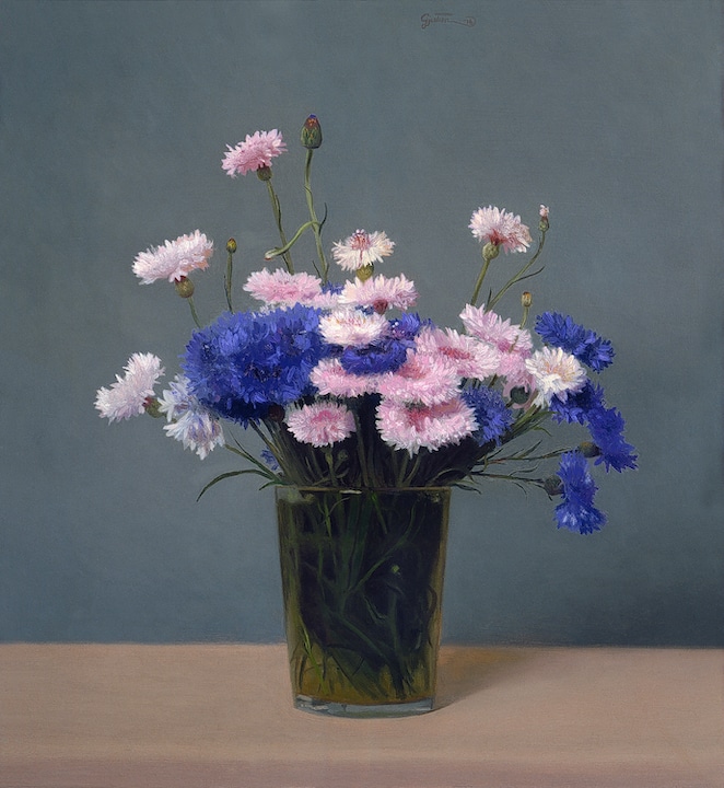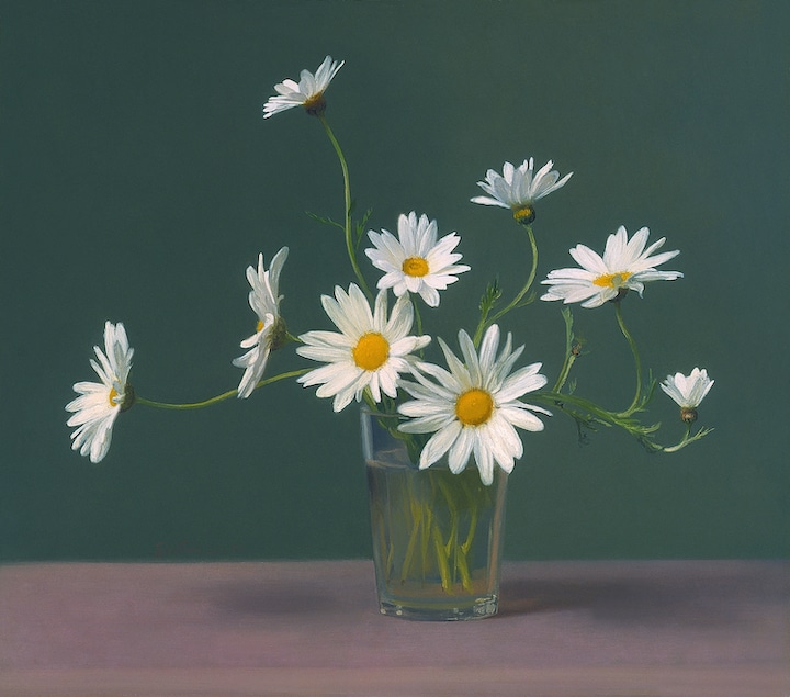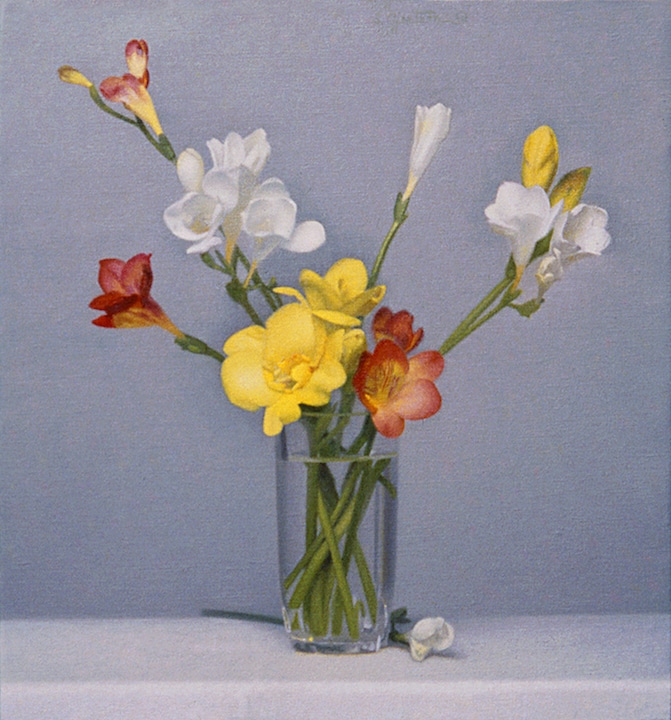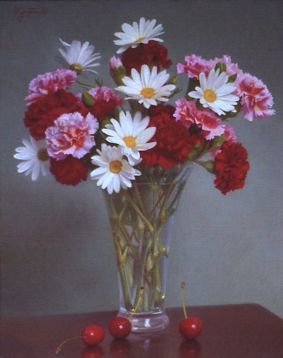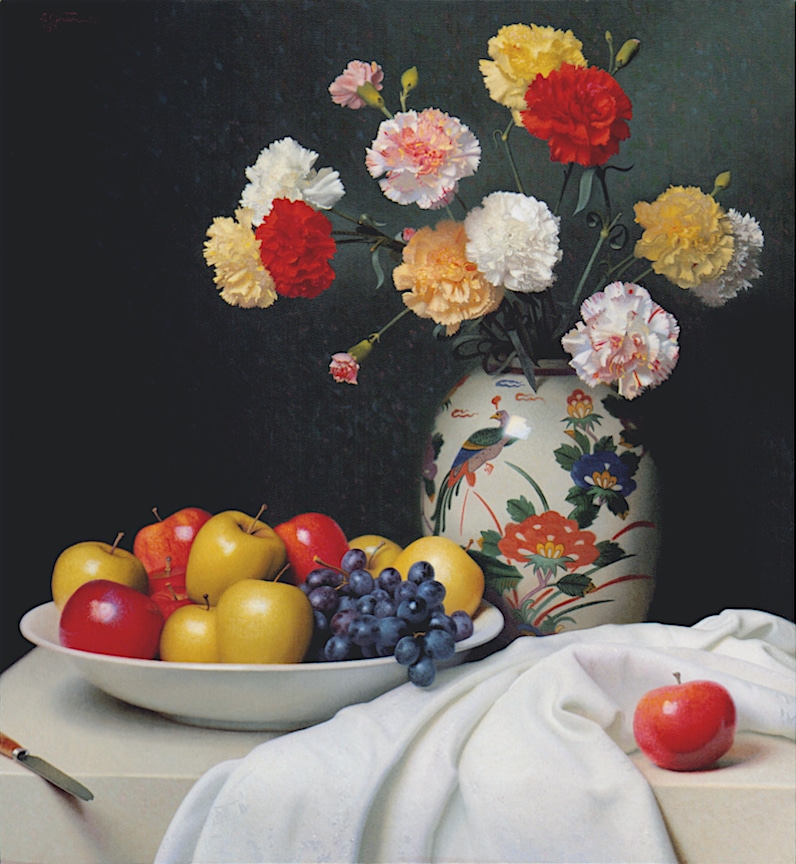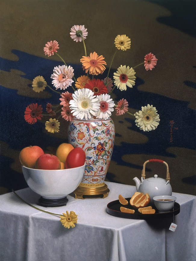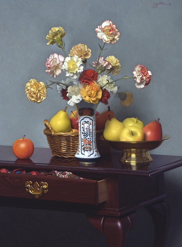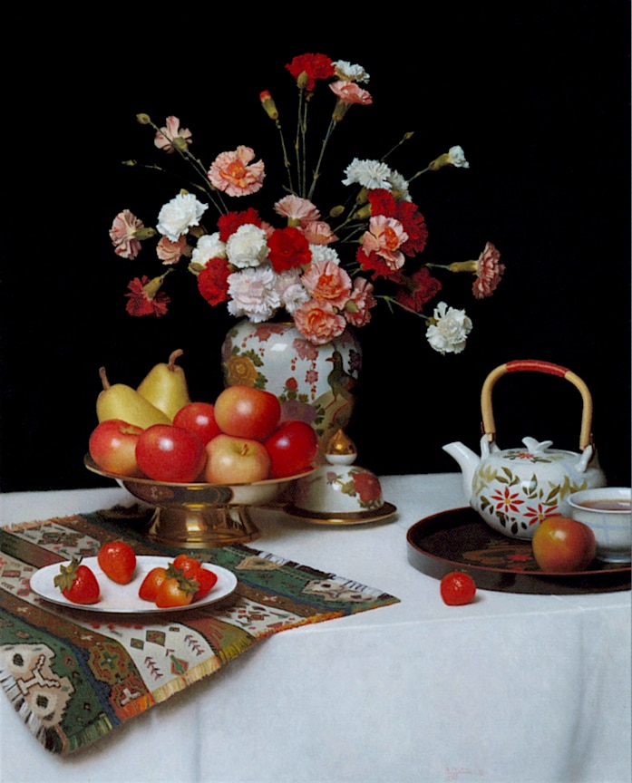 “The beauty of flowers and fruit never fails to inspire me. I will paint no still lifes without them. Our frenetic, media saturated age moves so fast that we often miss the beauty of simple things we see around us every day. I try to slow down and appreciate the marvelous beauty around me. I approach the paintings of flowers and fruit in a somewhat musical way, treating them as variations on a theme, preferring to paint them in shallow spaces and treating them in a decorative manner.”
